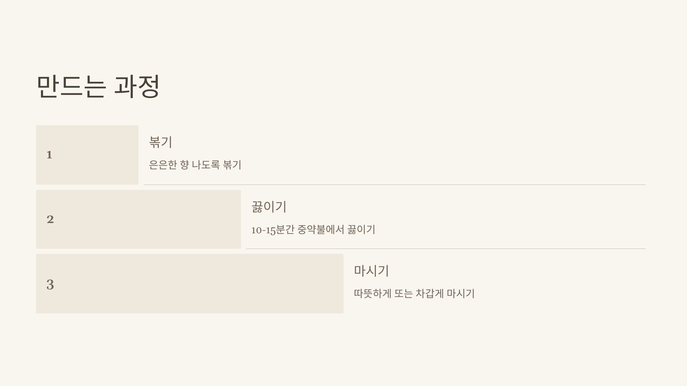 - 은은한 향이 올라오면 볶는 과정을 마칩니다. (볶지 않고 사용해도 괜찮습니다.)