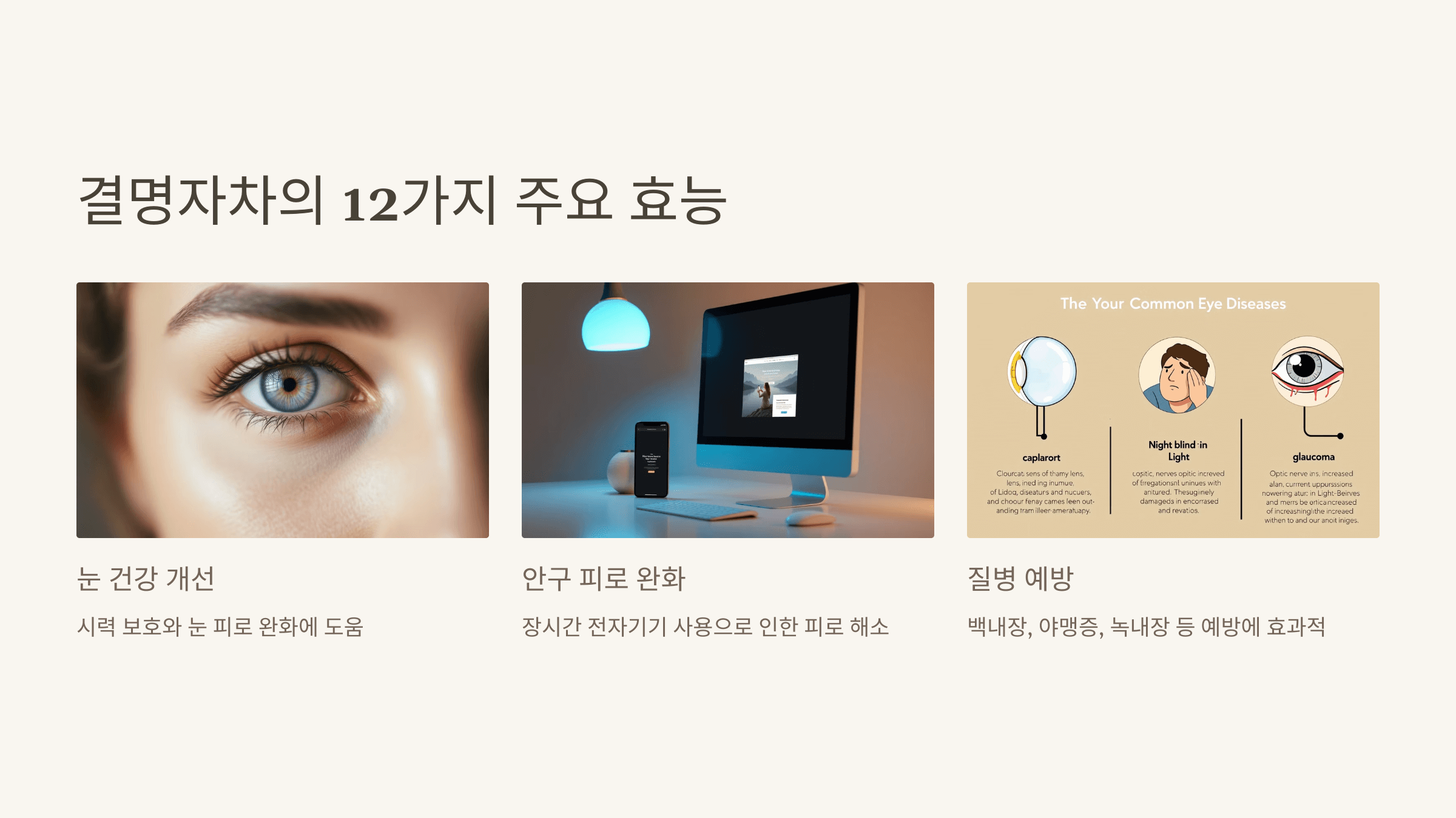 - 백내장, 야맹증, 녹내장 같은 눈 관련 질환 예방에 효과적입니다.