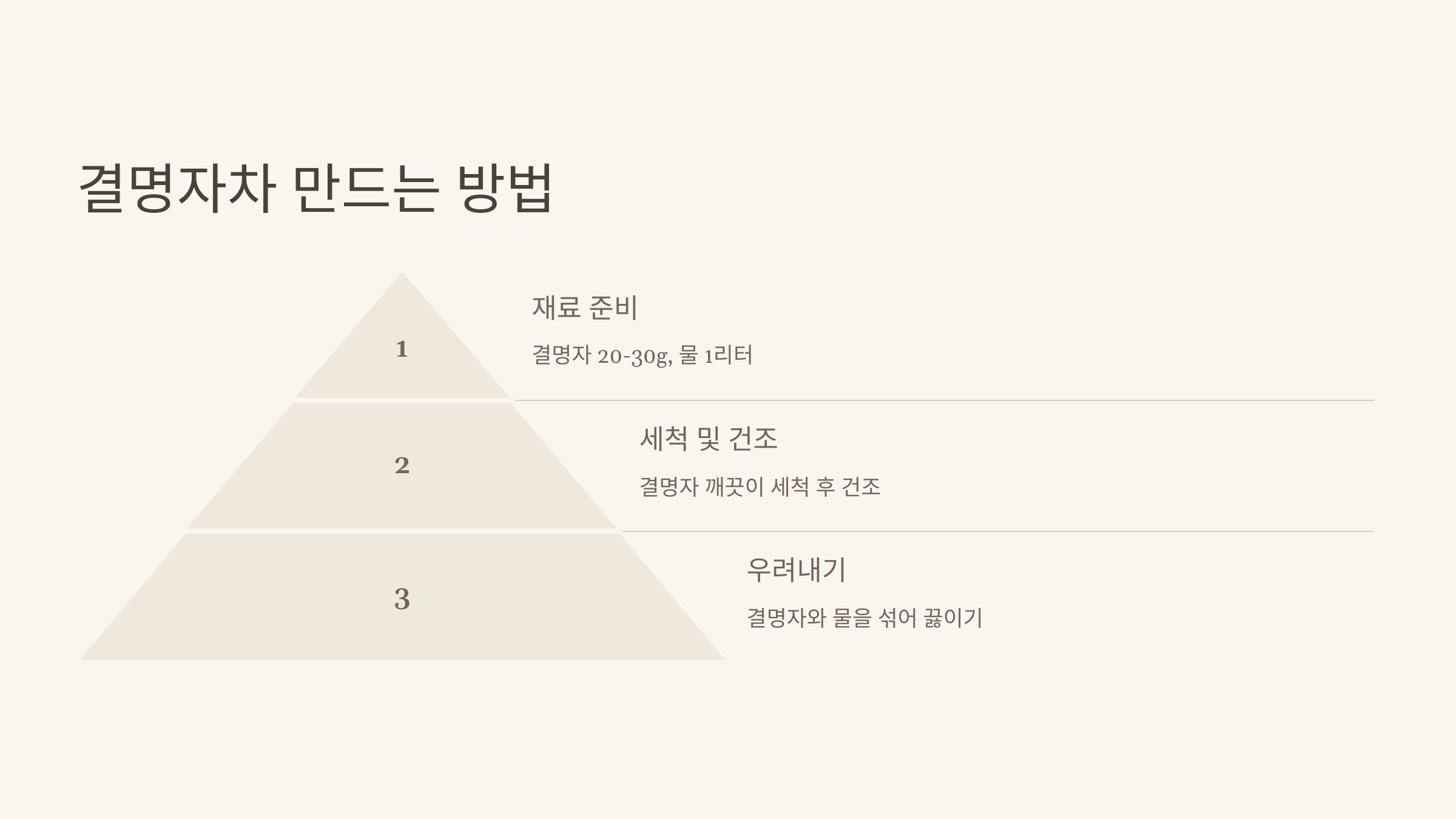 결명자차는 눈 건강, 간 해독, 혈압 조절 등 다양한 효능을 가진 건강 음료입니다. 간단한 과정으로 집에서 만들어 꾸준히 섭취하면 몸과 마음 모두에 긍정적인 변화를 느낄 수 있습니다.