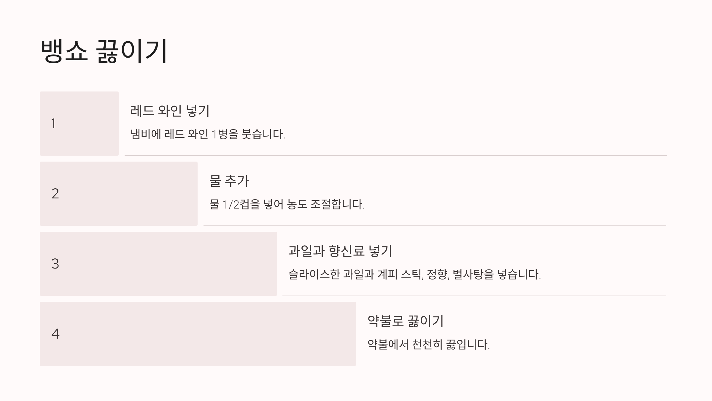 - 약불에서 천천히 끓입니다. (절대 센 불에서 끓이지 않도록 주의하세요. 와인의 알코올이 날아가고 맛이 변할 수 있습니다.)