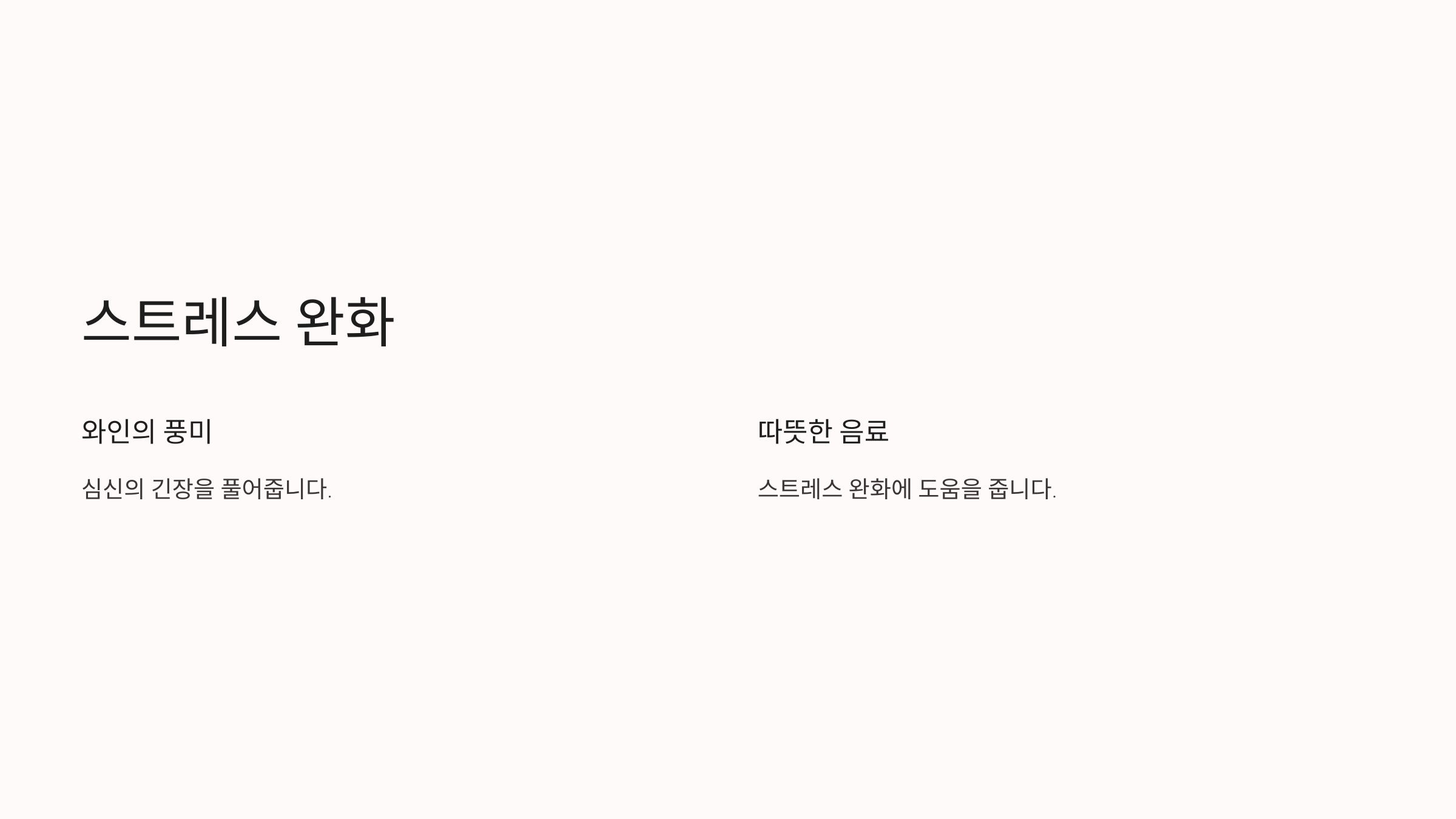 - 와인의 풍미와 따뜻한 음료가 심신의 긴장을 풀어주고 스트레스를 완화하는 데 도움을 줍니다.