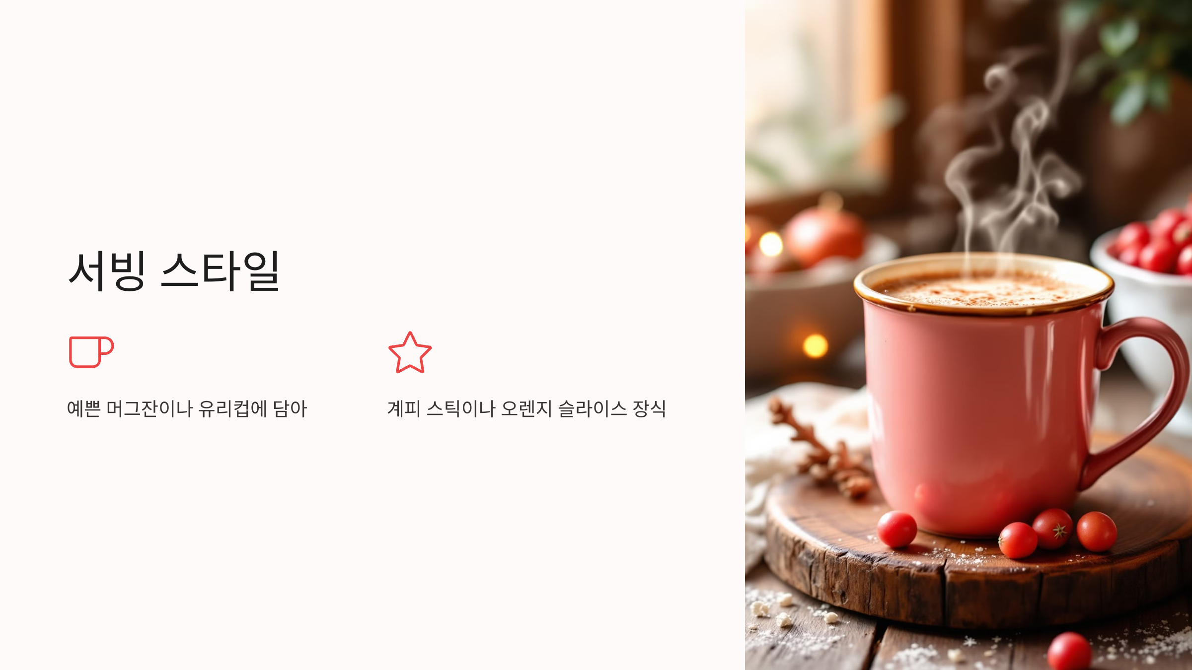 - 계피 스틱이나 오렌지 슬라이스를 컵 위에 올려 장식하면 더욱 완성도 높은 음료로 보입니다.