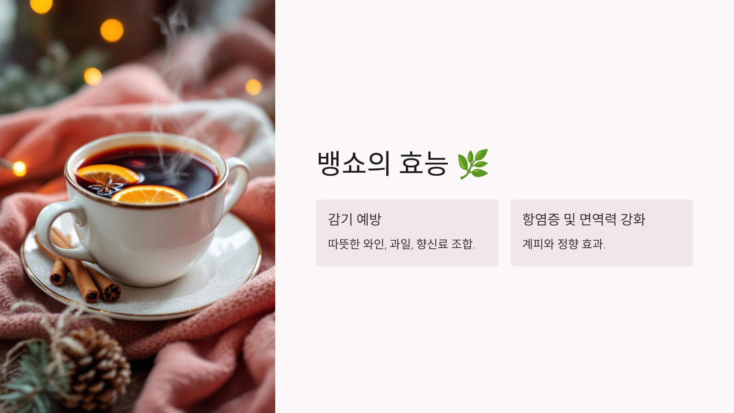 뱅쇼는 추운 계절, 몸을 따뜻하게 하고 면역력을 높이는 데 효과적인 음료입니다.