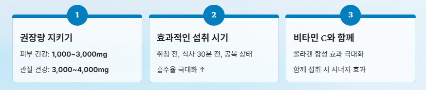 - 근육량 보존: 근육 조직의 1~10%는 콜라겐으로 구성되어 있으며, 근육 기능 유지와 성장에 기여합니다.