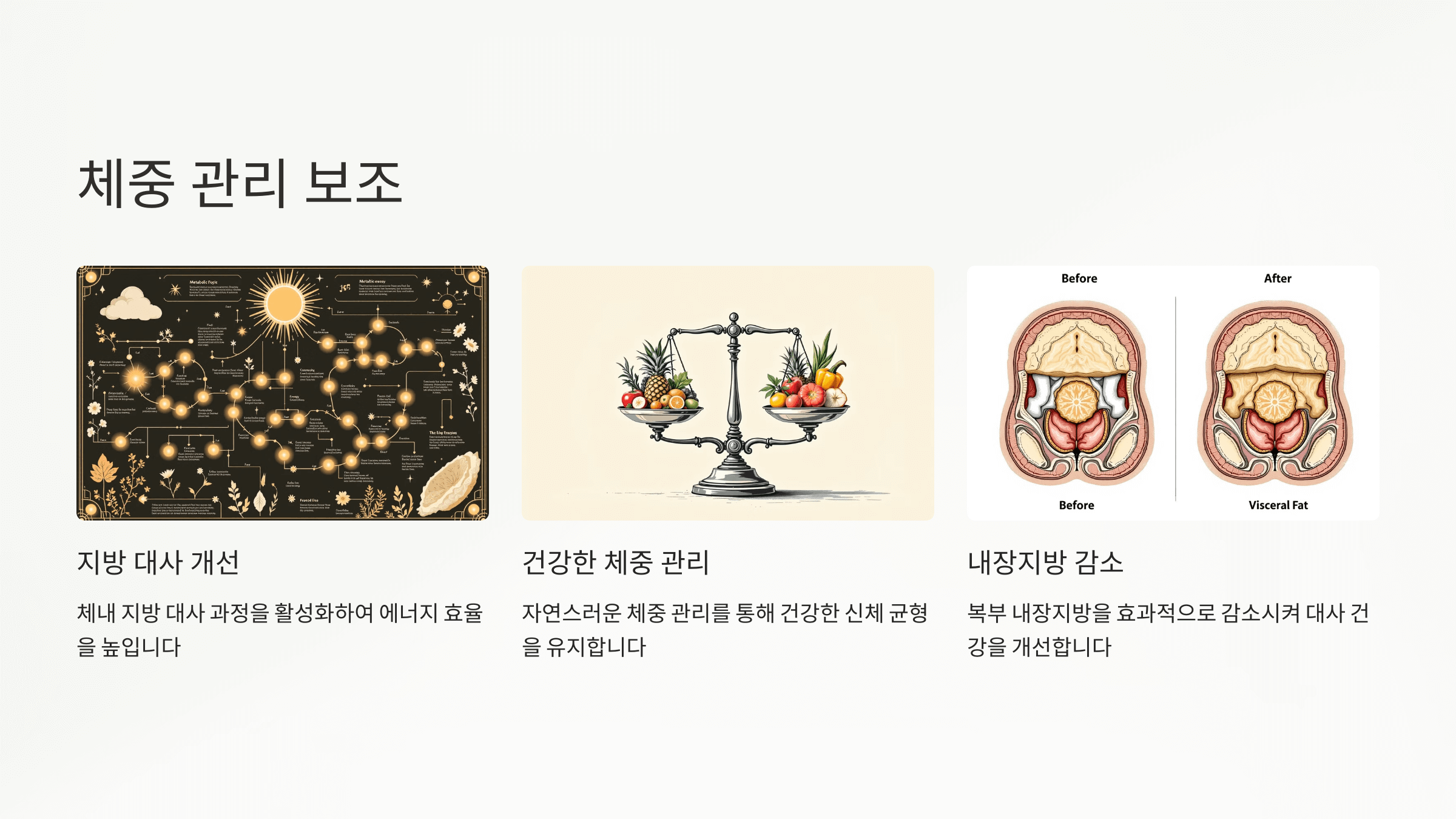 지방 대사를 개선하여 건강한 체중 관리를 돕습니다. 특히 내장지방 감소에 긍정적인 영향을 미칠 수 있습니다.