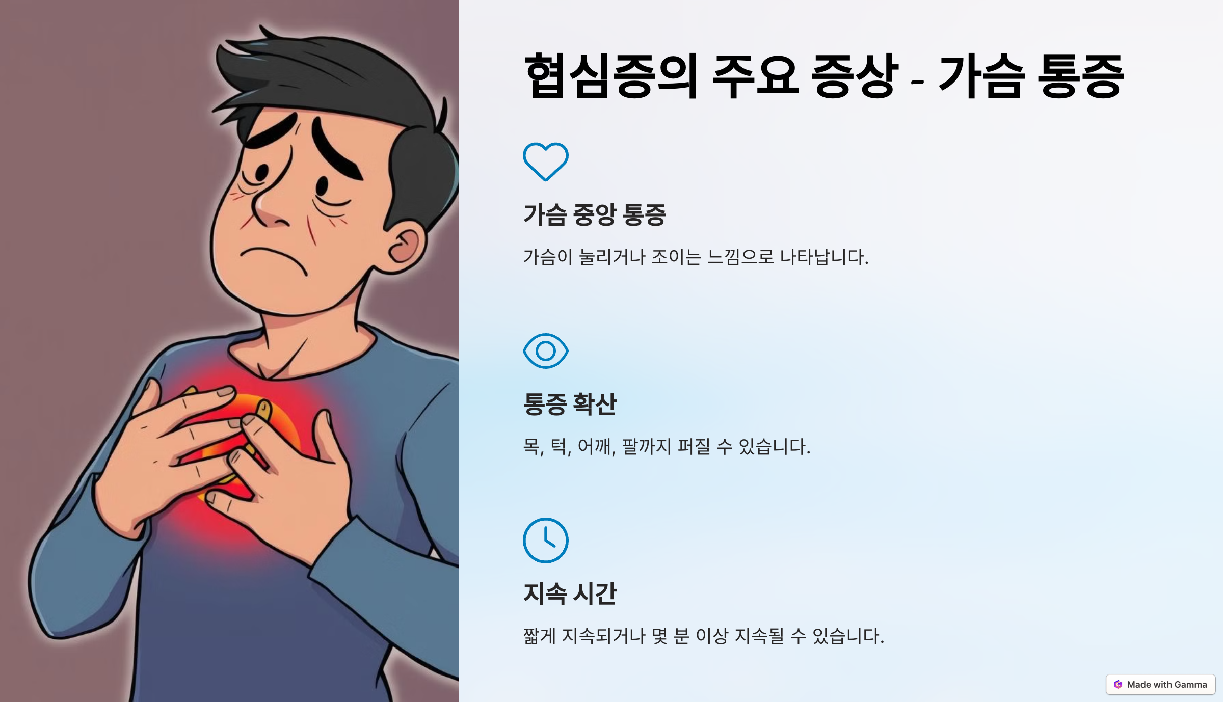 가슴에 묵직한 통증이 느껴진 적 있나요? 혹은 숨이 답답해지고 가슴이 갑자기 조이는 듯한 느낌을 경험한 적이 있으신가요? 😔 이런 증상이 있다면 '협심증'일 가능성이 있습니다. 협심증은 심장의 혈액 공급이 원활하지 않아 발생하는 질환으로, 심장 건강의 경고 신호일 수 있습니다. 🆘 이번 글에서는 협심증의 주요 증상에 대해 알아보고, 어떻게 대응해야 하는지에 대해 이야기를 나눠보겠습니다. 협심증, 그 무게를 가볍게 넘길 수는 없죠. 이제 하나씩 차근차근 알아볼까요?