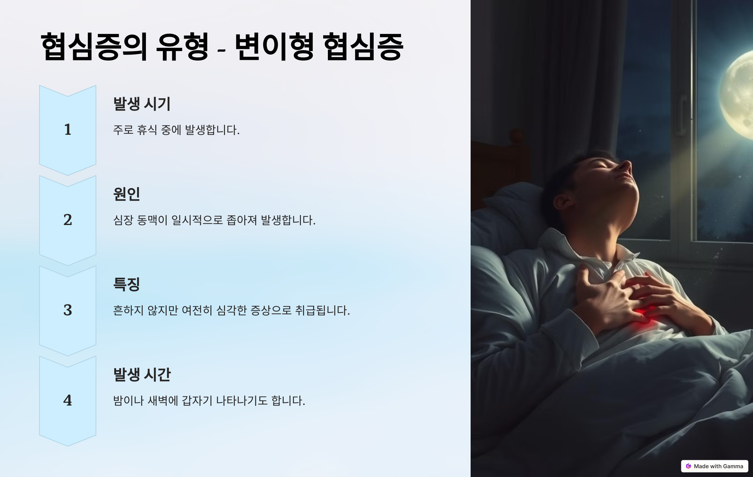 변이형 협심증은 주로 휴식 중에 발생하며, 심장 동맥이 일시적으로 좁아져 발생합니다. 이 협심증은 흔하지 않지만, 여전히 심각한 증상으로 취급됩니다. 😰 밤이나 새벽에 갑자기 나타나기도 하죠.